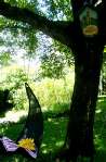 Unter dem großen Nussbaum lädt der Schwebesessel bei heißen Tagen zum Seele baumeln im kühlenden Schatten ein.